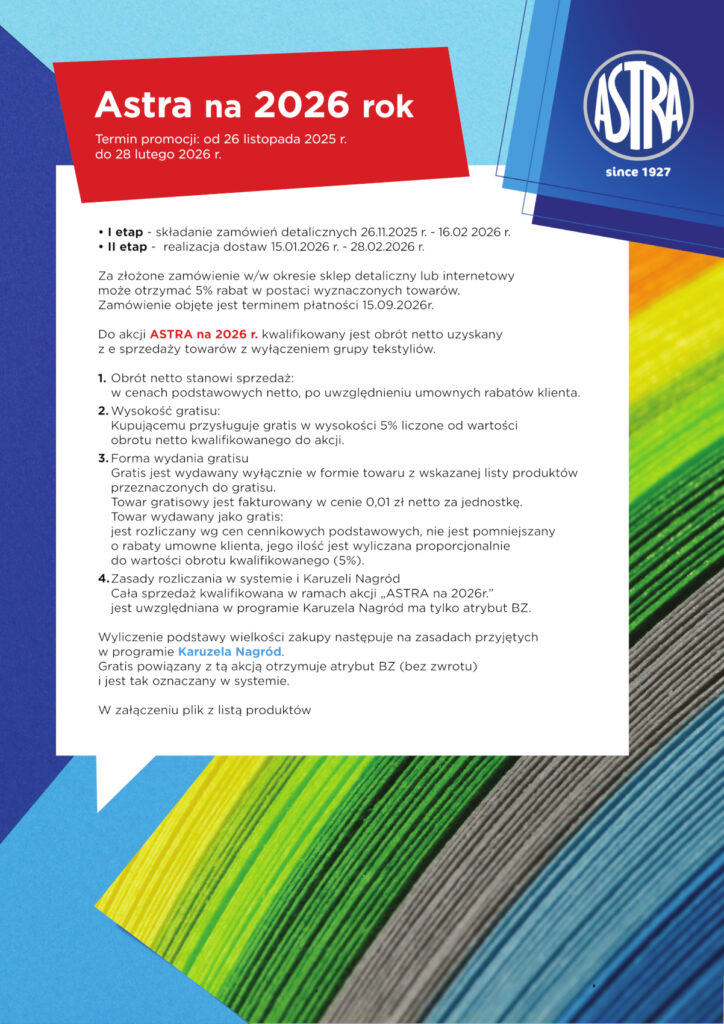 Nowy rok to idealny moment, by myśleć strategicznie o ofercie i zabezpieczyć sprzedaż na kolejne miesiące. Akcja Astra 2026 to propozycja dla sklepów, które chcą połączyć atrakcyjny rabat z długim terminem płatności i spokojnym planowaniem zatowarowania.